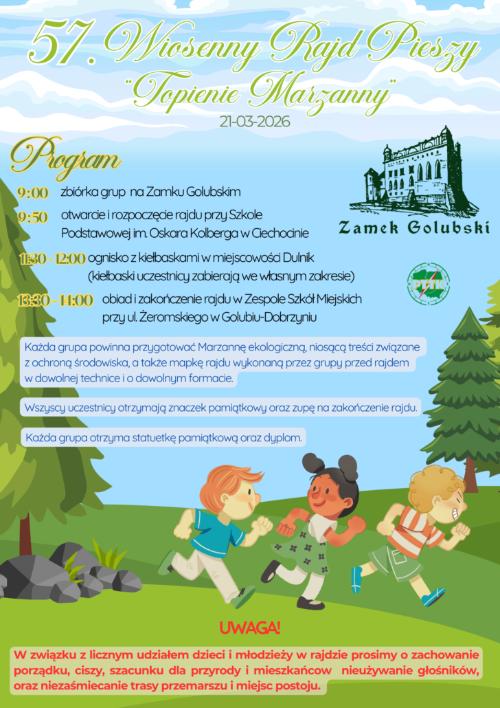 Serdecznie zapraszamy grupy dzieci i młodzieży do udziału w tradycyjnym Wiosennym Rajdzie Pieszym „Topienie Marzanny”. Wydarzenie łączy aktywny wypoczynek z ekologiczną edukacją i radosnym powitaniem wiosny.