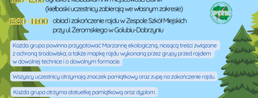 13:30-14:00 – Obiad i zakończenie rajdu w Zespole Szkół Miejskich przy ul. Żeromskiego w Golubiu-Dobrzyniu.